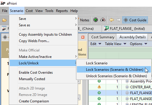 However, locking an assembly scenario does not lock the assembly’s subcomponent scenarios. Because the cost of active subcomponent scenarios can change, those changes are reflected in the locked assembly scenario costs.