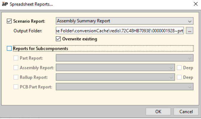• Assembly Report: When this check box is selected, aPriori creates a report for each subassembly that is a direct child of the top-level assembly or rollup . The adjacent drop-down menu is used to specify the desired type of report.