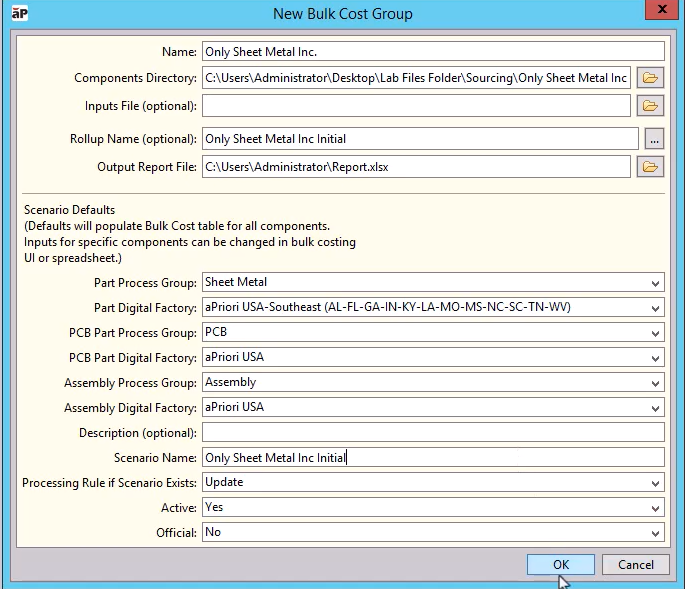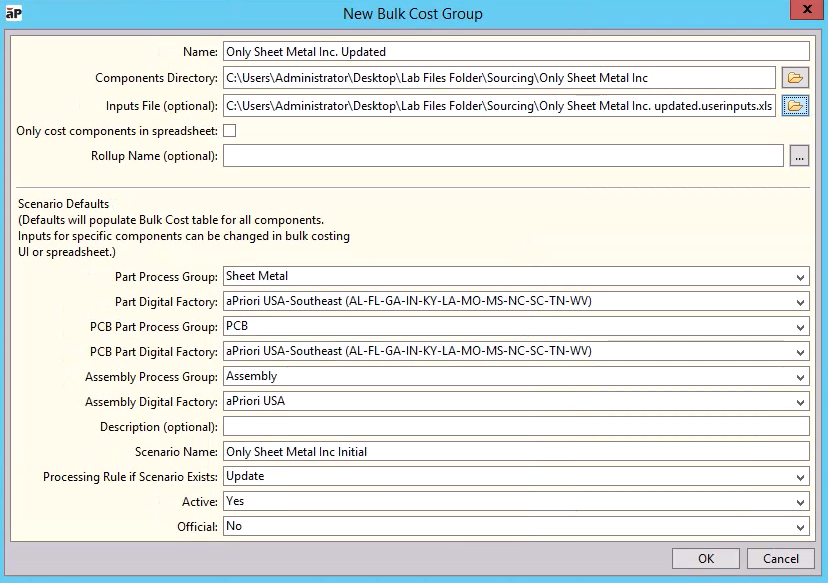 Save the updated Excel file, then return to aP Pro, and create a new Bulk Cost Group, selecting the updated Excel sheet as you Inputs file and giving a new name for a roll-up to view after costing: