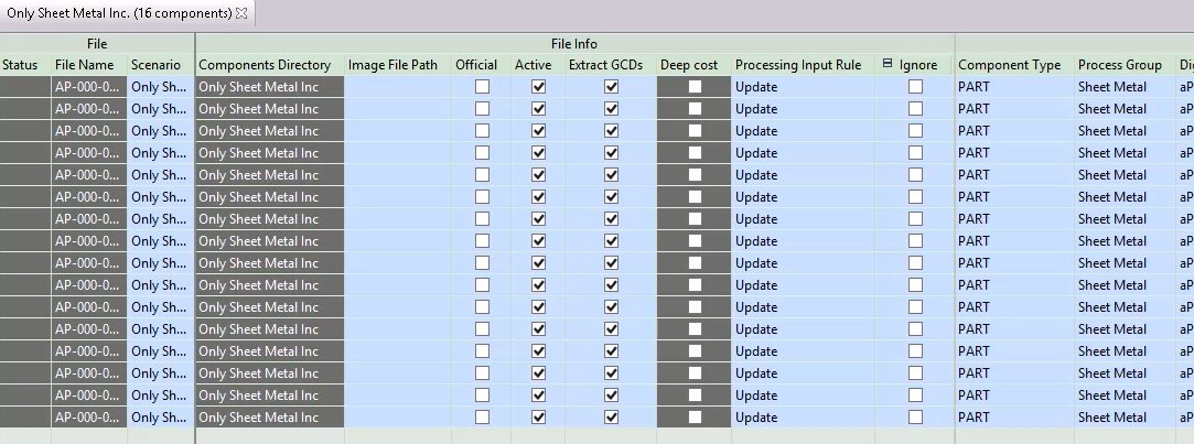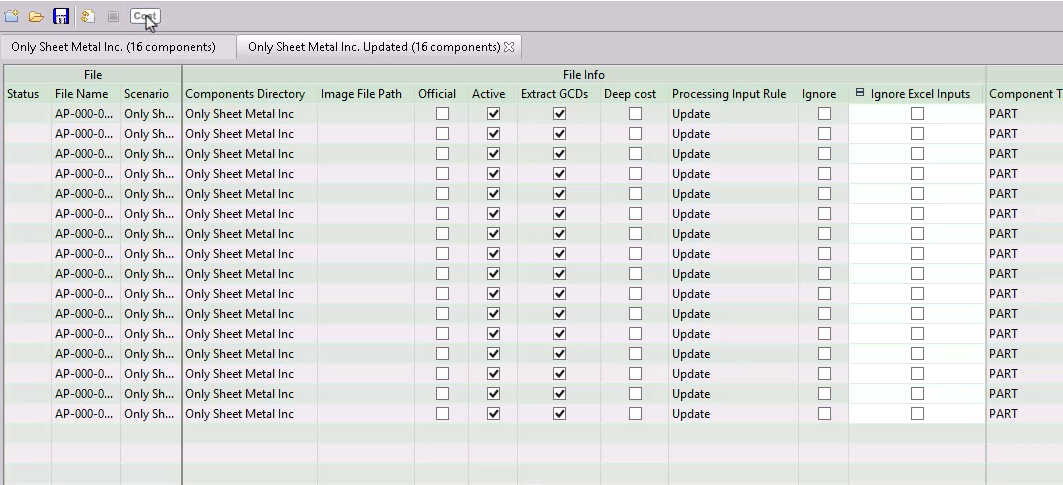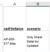 Before saving the updated Excel sheet, update the scenario name, to avoid override the existing one when you run bulk costing. Change the scenario name to Only Sheet Metal Inc Updated for all entries in the scenario column: