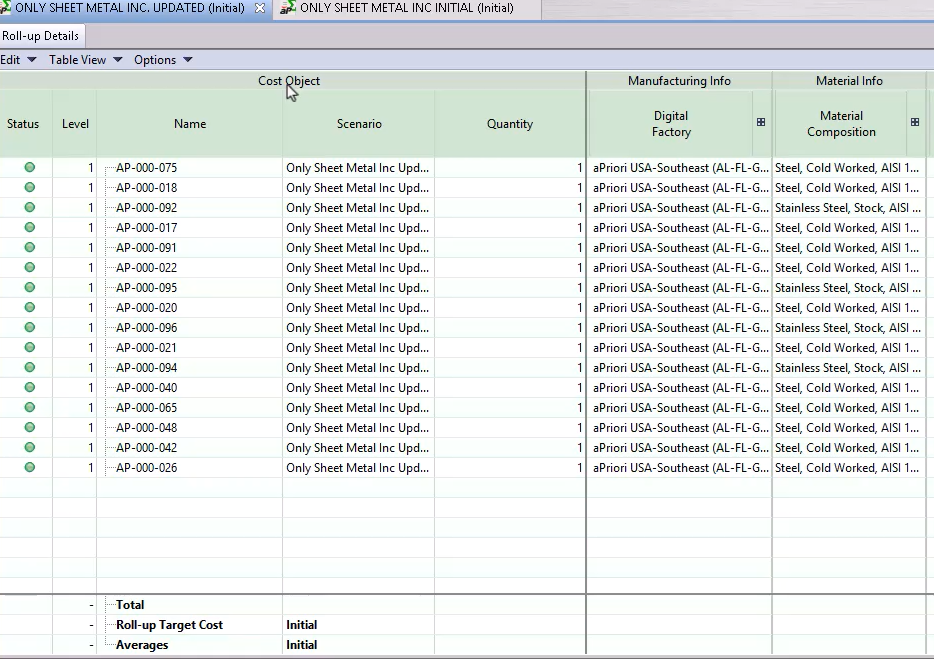 When costing is complete, click OK and the roll-up will open for review: