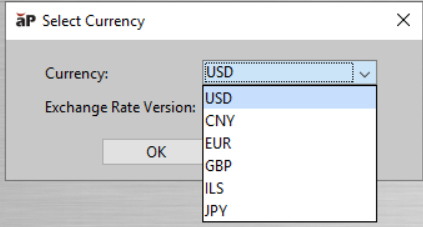 Select View > Change Currency to display the Select Currency window: