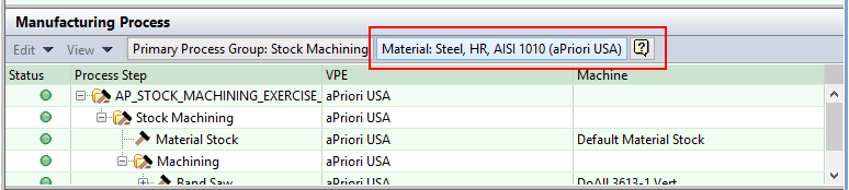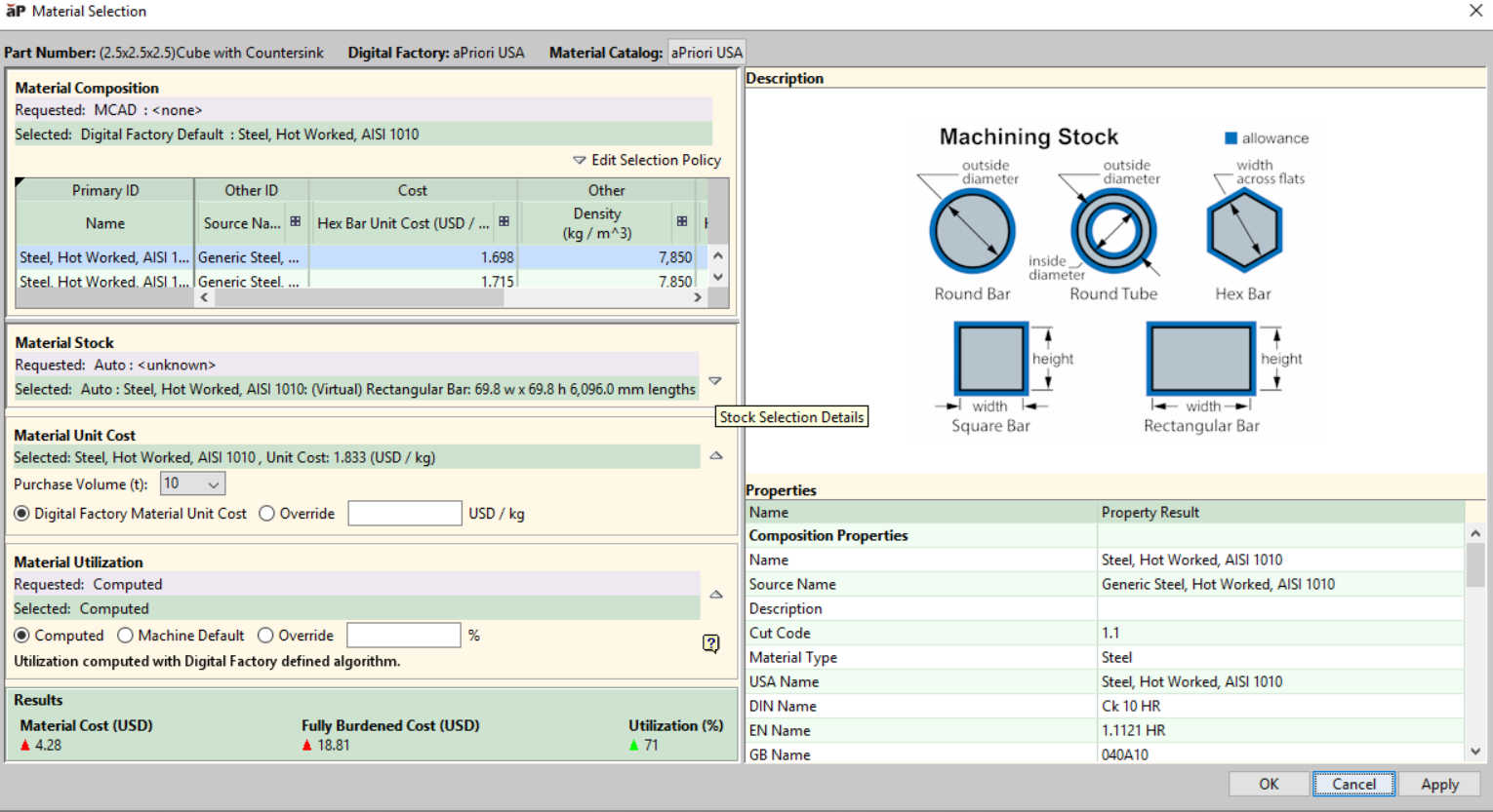 - Digital Factory Default: The default material defined for that Digital Factory. See the aPriori Administrator Guide.