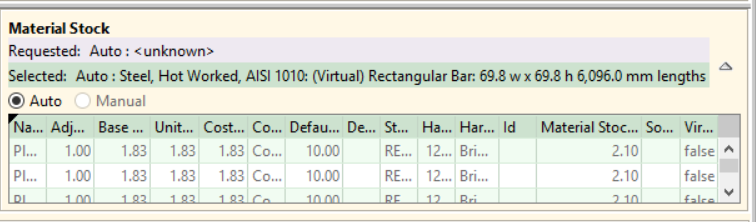 Manual: Select a different material stock from the list of material stock available for the selected material composition. For example, changing the stock size.