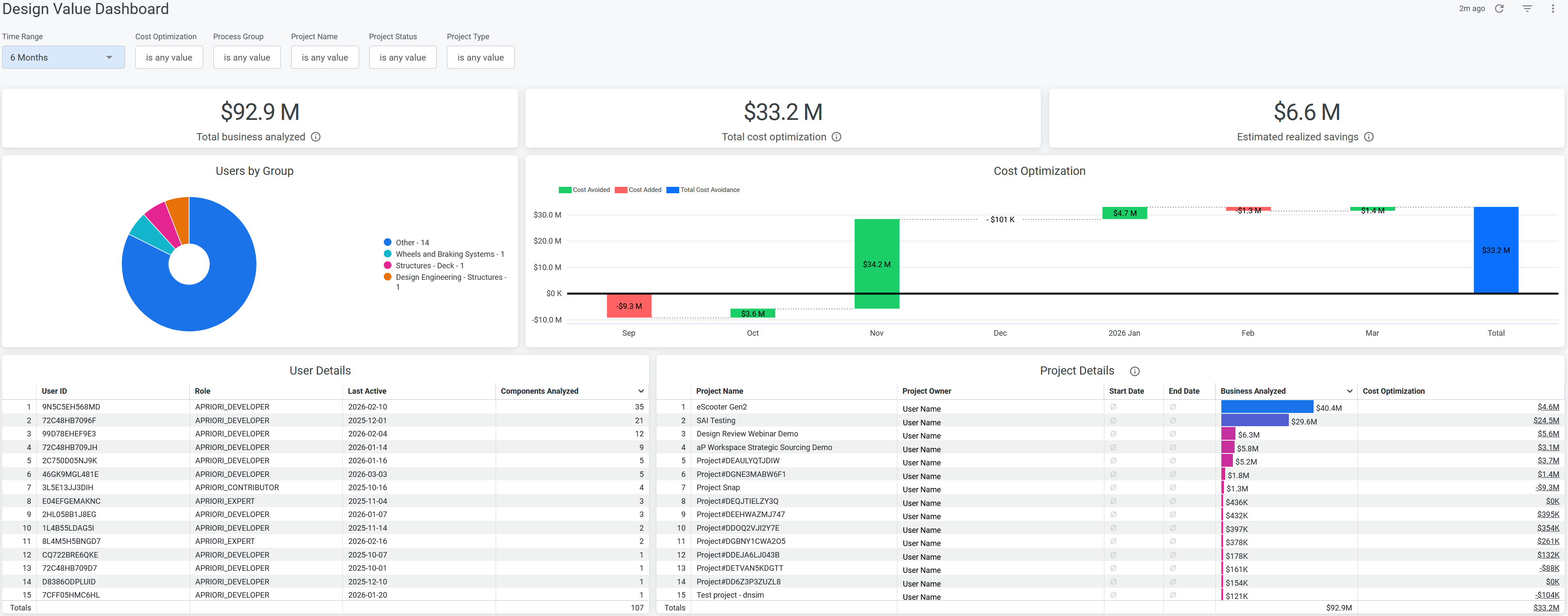 The Design Value Dashboard is part of aPriori's Value Tracking product suite, and enables project leaders to see how design teams use aPriori to help cost optimization, profitability improvement, and time-to-market.