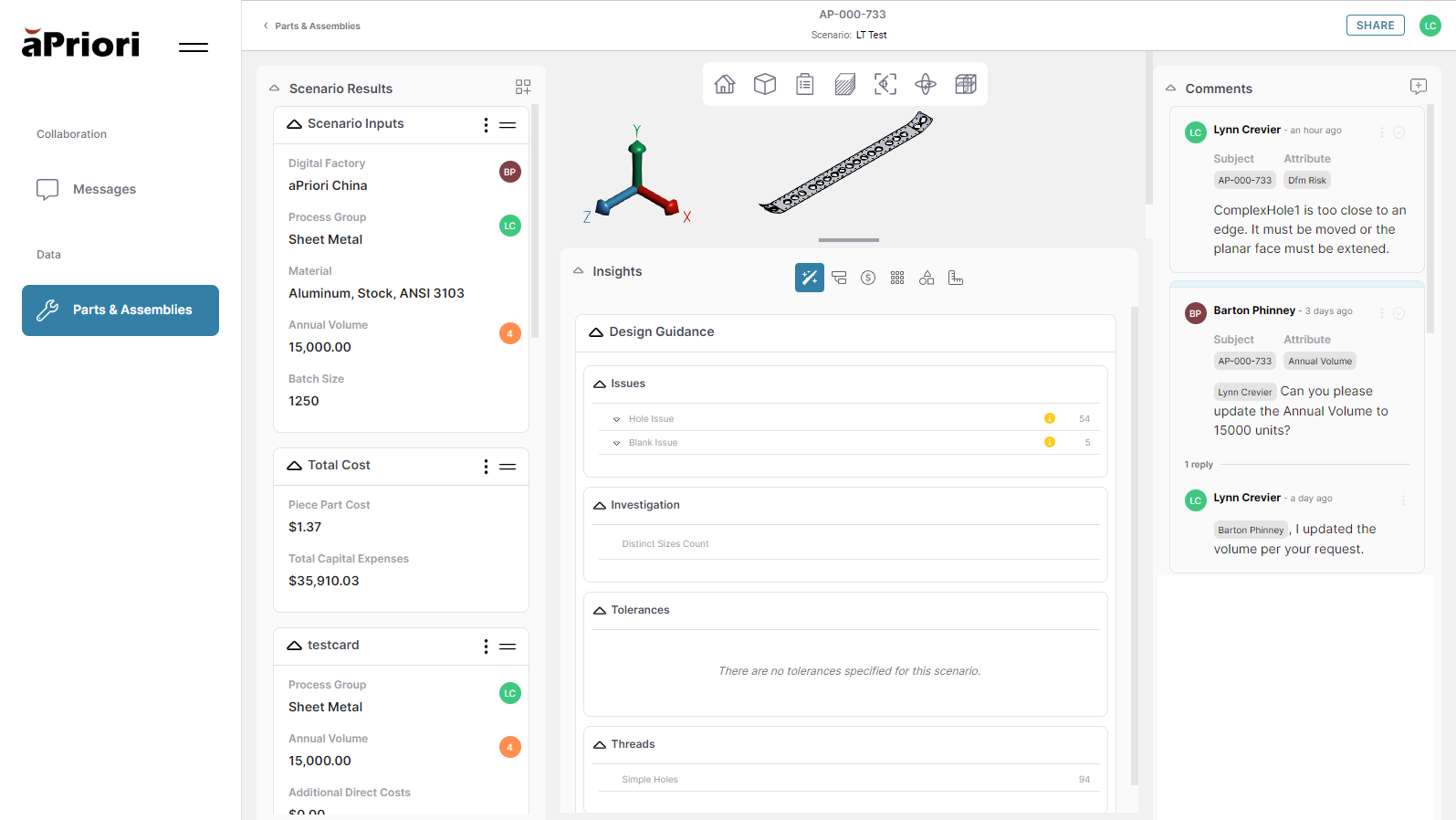 aP Workspace is a new co-working application for managing scenario tasks and collaborating seamlessly with internal stakeholders on product cost, manufacturability, and sustainability. aP Workspace provides real-time collaboration and unified product design and manufacturing data in a single environment. Users create scenarios of aPriori analysis and tag colleagues in aP Workspace to pose questions, provide comments, follow up on tasks, and use traceability to understand a project evolution.