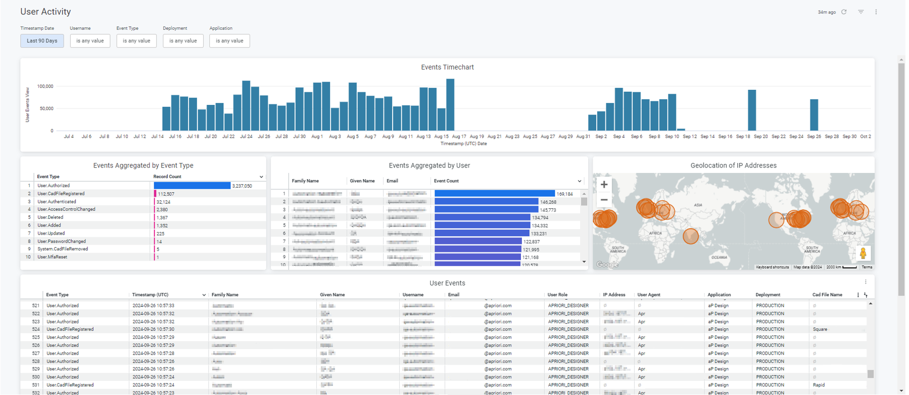 Administrators can view recent history of their aPriori Cloud user activity with the User Activity Dashboard. This dashboard shows information about user access and actions in the aPriori Cloud, supporting customers with tracking security events, application adoption, CAD File retention, and more.